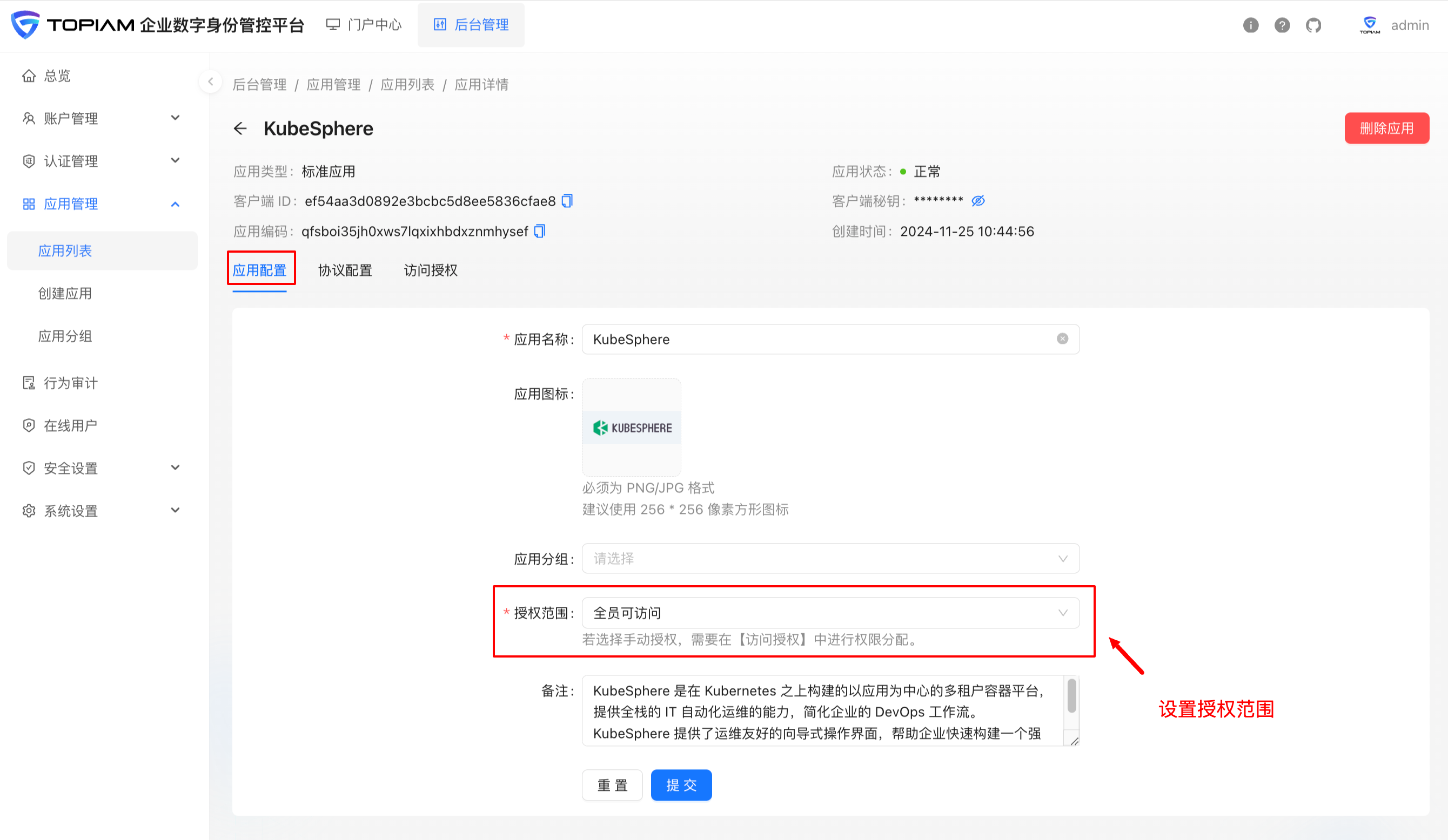 授权范围:改为全员可访问,手动授权请参考应用授权进行配置。