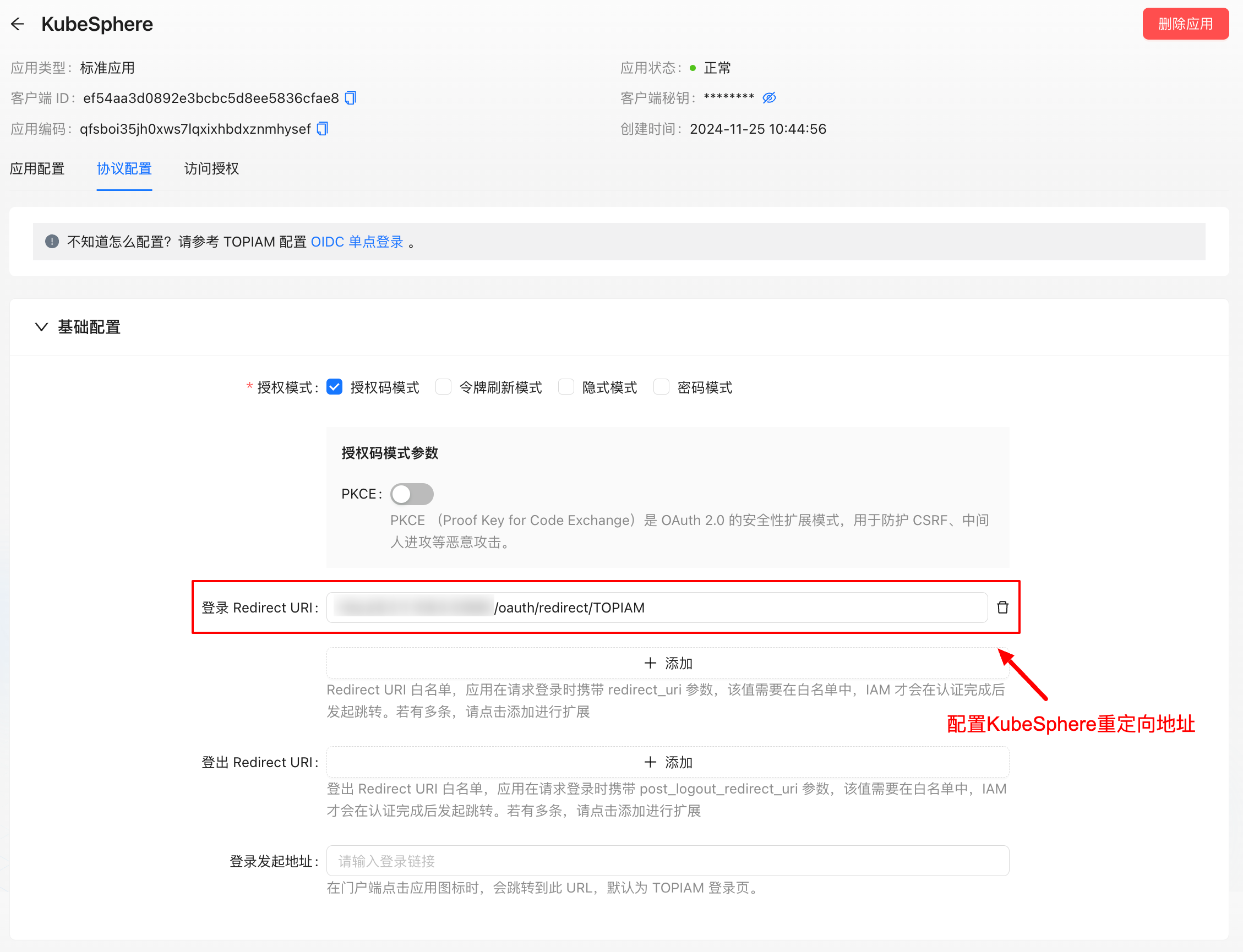 - 配置登录 Redirect URI,默认为: