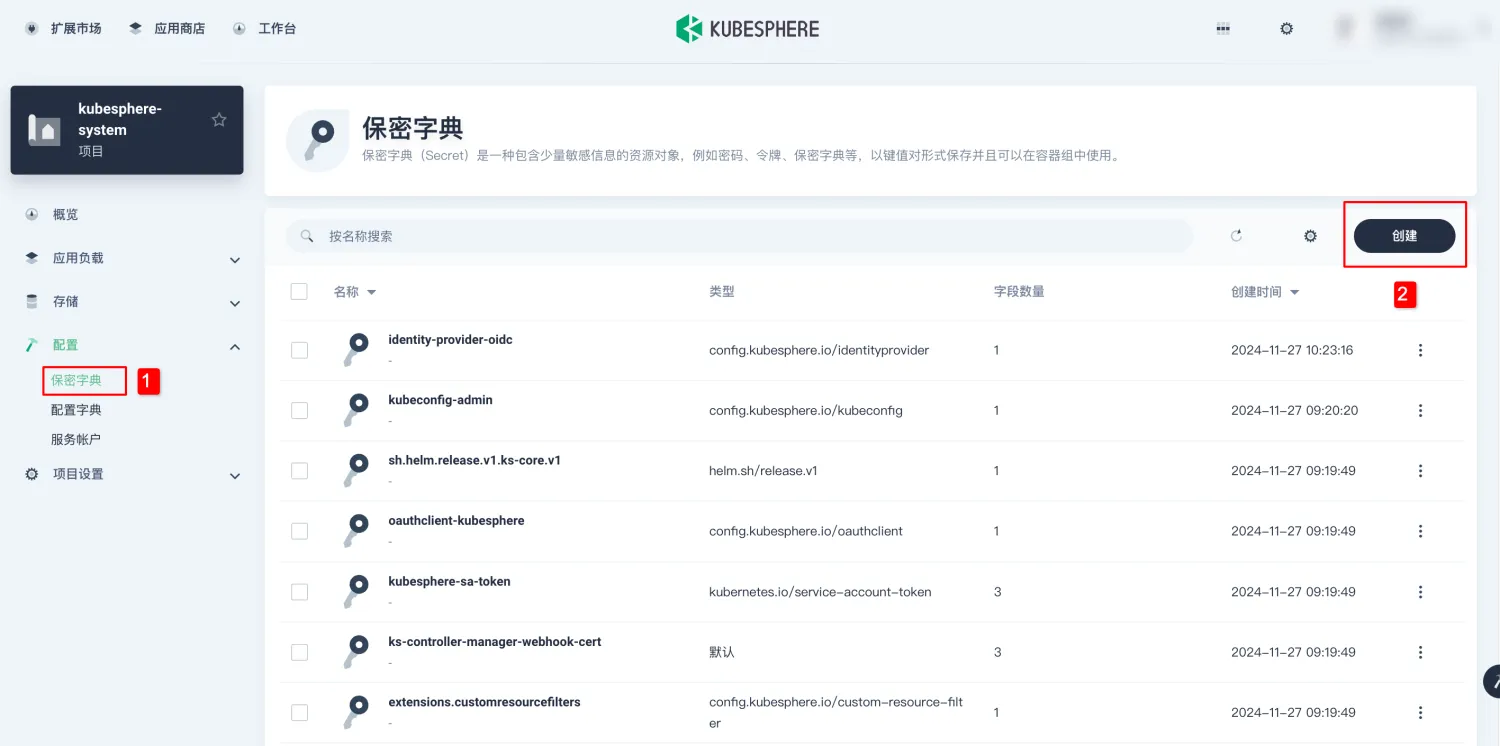 - 在进入项目后,请依次选择“保密字典”菜单项,随后点击“创建”按钮以新建字典。