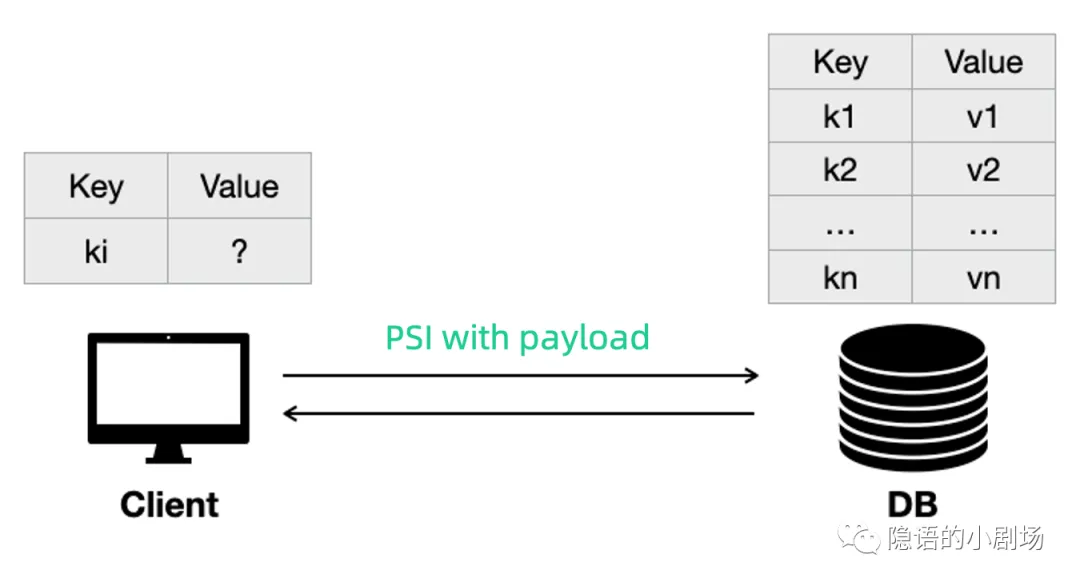 其实就是 one-element PSI with Payload。PSI with Payload 使用 client 的输入 ki 以及 DB 的输入 {k1,…, kn} 进行撞库,把匹配后数据(也就是 ki)的 value 返回给 client。