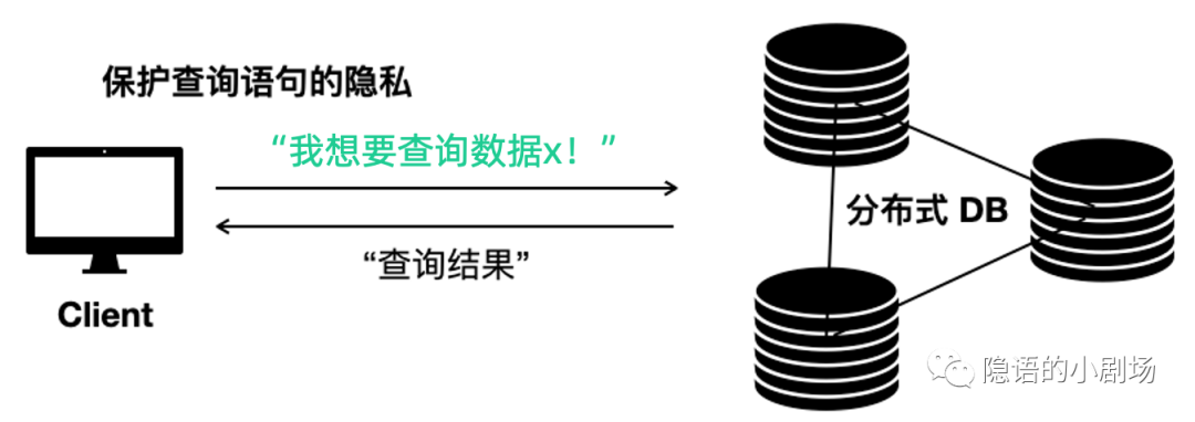 我们可以看到,PIR 场景中的实体有 client 以及 server,并且 client 向 server 发送了一个需要保护隐私的 query ,server 向 client 返回一个 query 的最终结果。