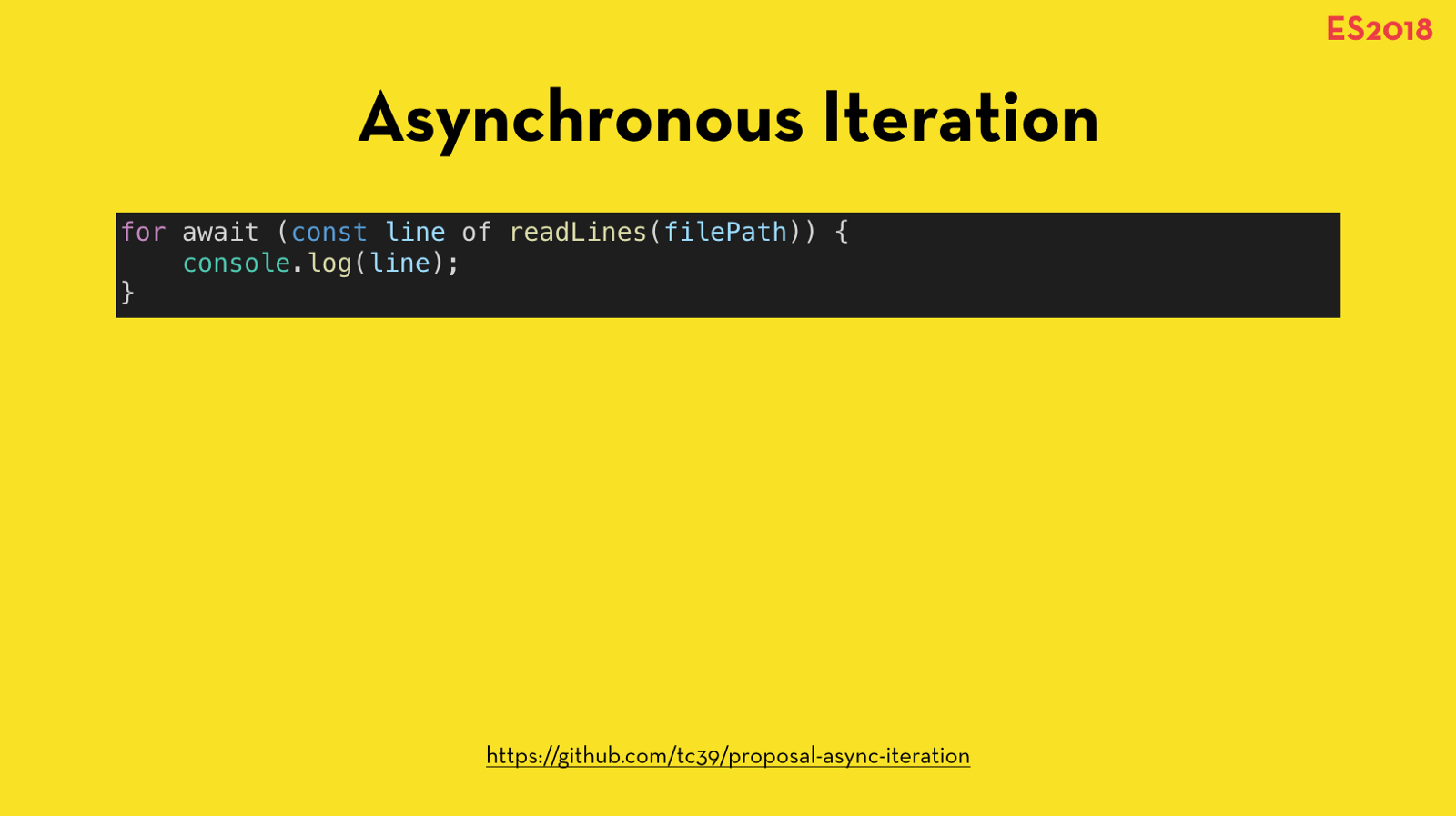 使用 异步迭代 我们得到异步迭代器和异步迭代。 异步迭代器就像常规迭代器一样,除了它们的next()方法之外,它返回一个{value,done}对的promise。 为了使用异步迭代,我们现在可以使用带有for ...ofloops的await关键字。