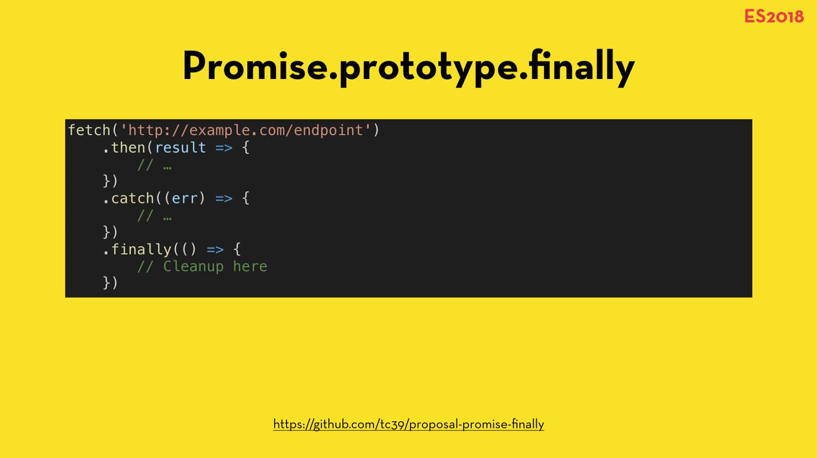 一个典型的用例是在fetch()请求之后隐藏一个微调器:而不是复制最后一个.then()和.catch()中的逻辑,现在可以将它放在.finally()