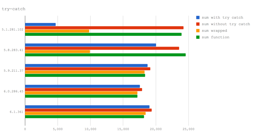 我们可以看到,在 Node 6 (V8 5.1)中,“try/catch”产生的性能问题是真实存在的,但是在 Node 8.0-8.2 (V8 5.8)中,对性能的影响明显降低了很多。