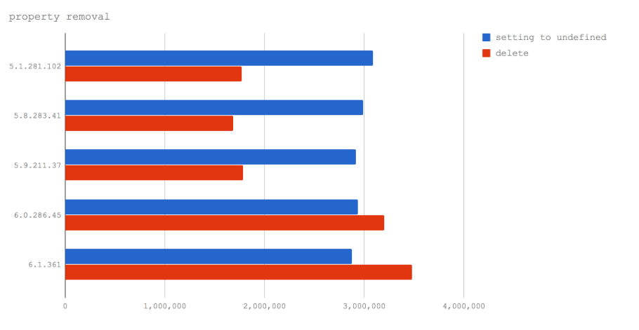 在V8 6.1(尚未在任何 Node 发布版中使用)中,操作对象上已删除属性特别快,甚至比设置为“undefined”还快。这是一个很好的消息,因为现在我们可以使用 delete ,并且用 delete 更快。