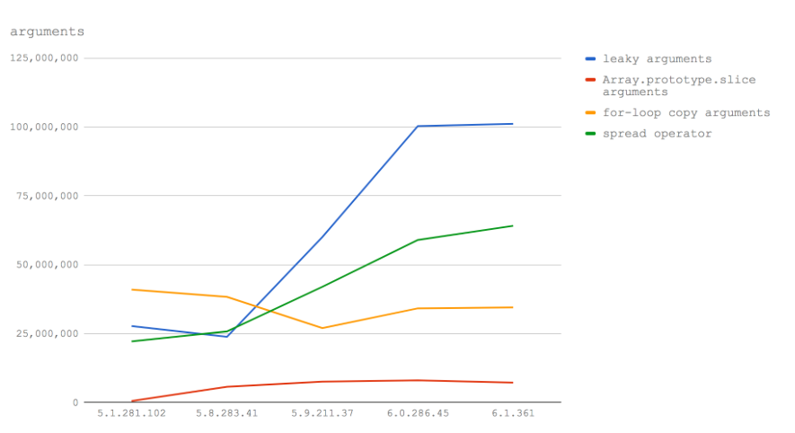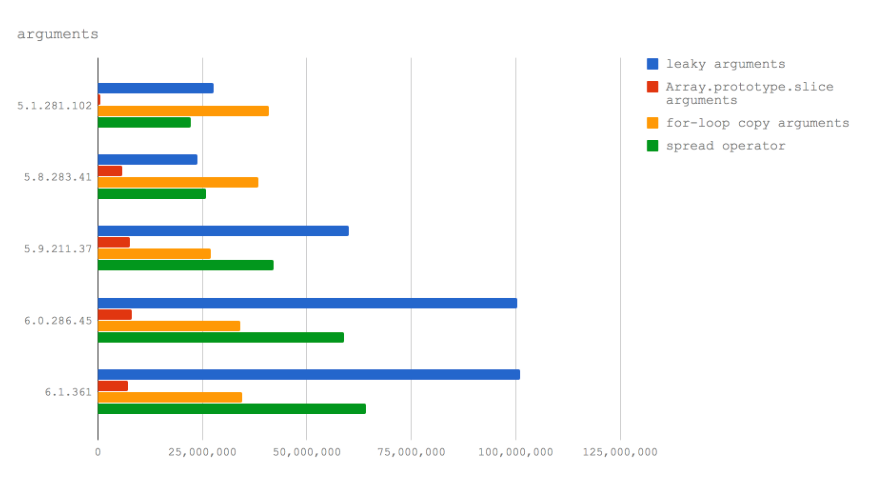 下一个微基准测量了我们四个V8版本中两个相互关联的主题:泄漏“参数”的成本以及将参数复制到数组中的成本(随后从函数范围中暴露来代替“arguments”对象)。