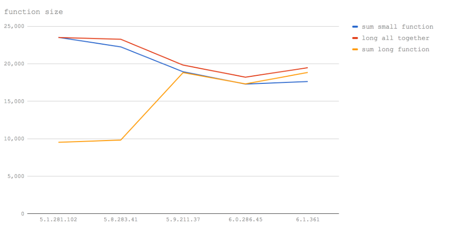 在5.9及更高版本(Node 8.3+)中,任何通过不相关字符(如空白或注释)添加的大小与功能性能无关。这是因为Turbofan使用函数AST抽象语法树来确定函数大小,而不是使用Crankshaft中的字符计数。不是检查字节数的功能,它考虑了函数的实际指令,使得从V8 5.9(Node 8.3+)**空格,变量名字符计数,函数签名和注释不再是一个函数是否内联的因素。