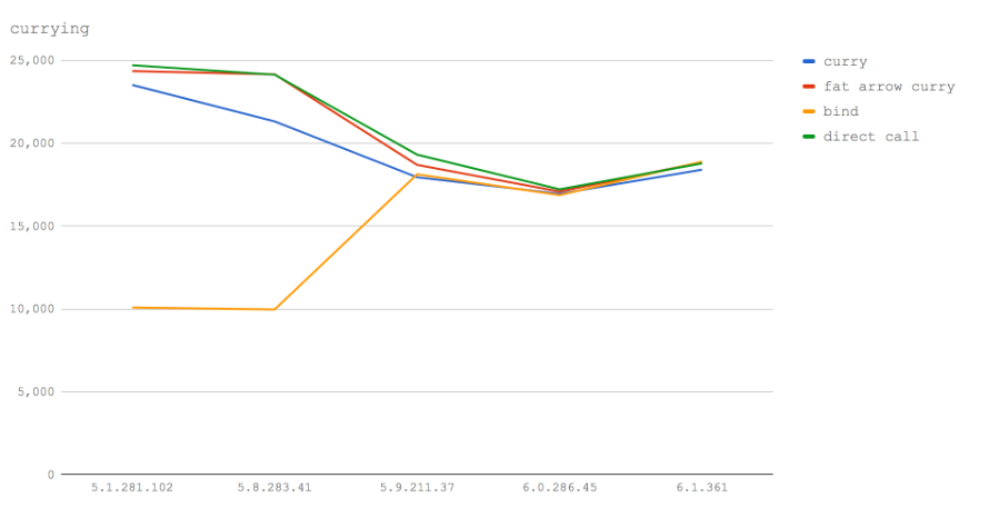 在所有版本中,使用箭头函数是最接近直接调用的。 在后面的新版本中使用箭头函数的代码将和使用“bind”一样接近,而且目前比使用正常的函数更快。 然而,作为一个警告,我们可能需要使用不同大小的数据结构来测试更多类型的部分应用,以获得更全面的图表。