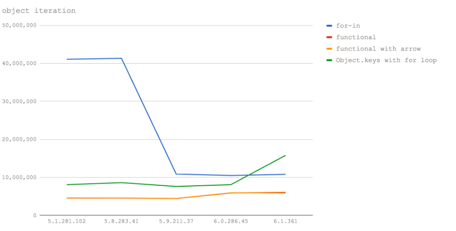 在Node 6(V8 5.1)和Node 8.0-8.2(V8 5.8)中使用for-in是到目前为止循环一个对象的所有key最快的方法,然后在循环内访问对象的值。每秒大约有4000万次操作,比最接近的方法要快5倍,Object.keys在800万次左右。