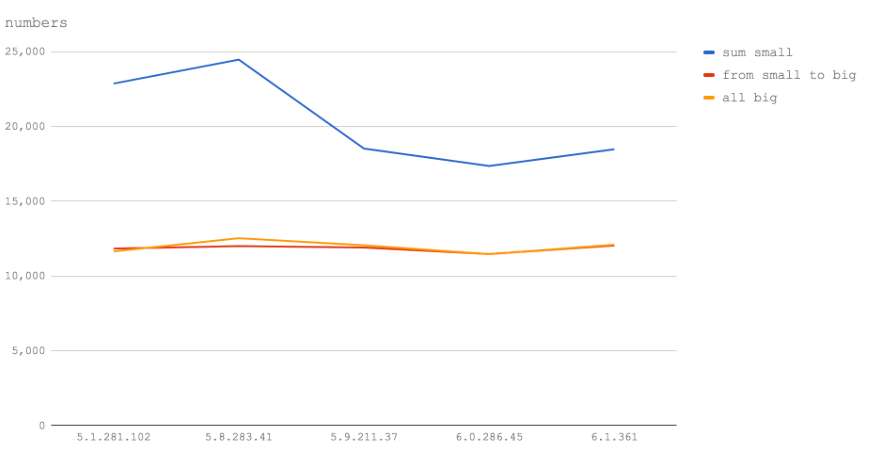 值得注意的是,32位范围内的数字在Node 6(V8 5.1)和Node 8.1和8.2(V8 5.8)之间的速度增加也非常明显,但在Node 8.3+(V8 5.9+)中明显变慢。由于大数字根本没有影响速度,所以很有可能这是真正的(32位)数字处理速度减慢的原因,而不是与函数调用或循环速度有关(在基准代码中使用的) 。
