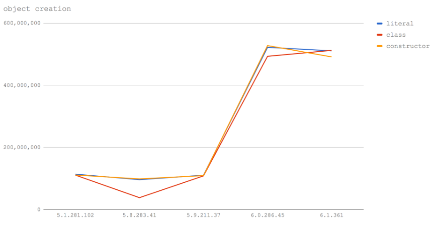 然后在V8 6.0(可能在 Node 8.3 版本,或者在 Node 8.4 版本)和6.1(目前不在任何Node发布版)对象创建速度不可思议地超过5亿 op/s!这是令人难以置信的。