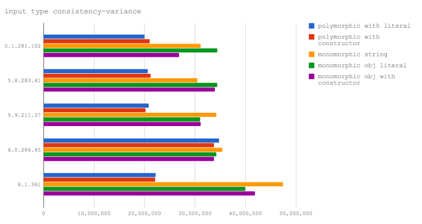 V8 6.1(未来的 node 版本)中单态和多态函数之间存在更大的性能差距,这进一步证明这个观点。然而,值得注意的是,这基于使用 nightly-build V8版本的node-v8分支 - 它可能不会在V 8 6.1中的具体实现。
