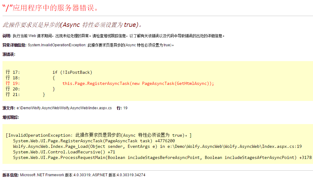 using System;using System.Collections.Generic;using System.IO;using System.Linq;using System.Net;using System.Text;using System.Threading.Tasks;using System.Web;using System.Web.UI;using System.Web.UI.WebControls;namespace Wolfy.AsyncWeb{ public partial class Index : System.Web.UI.Page { protected void Page_Load(object sender, EventArgs e) { if (!IsPostBack) { this.Page.RegisterAsyncTask(new PageAsyncTask(GetHtmlAsync)); } } private async Task GetHtmlAsync() { string url = "http://www.cnblogs.com/"; WebClient client = new WebClient(); client.Encoding = Encoding.UTF8; string html = await client.DownloadStringTaskAsync(url); string strPath = MapPath("~/html"); if (!Directory.Exists(strPath)) { Directory.CreateDirectory(strPath); } string savePath = Path.Combine(strPath, "blog.txt"); using (FileStream fs = new FileStream(savePath, FileMode.Create, FileAccess.Write, FileShare.ReadWrite)) { byte[] buffer = Encoding.UTF8.GetBytes(html); await fs.WriteAsync(buffer, 0, buffer.Length); } } }}这时候以为大功告成了,浏览页面的时候发现还是少了点东西。