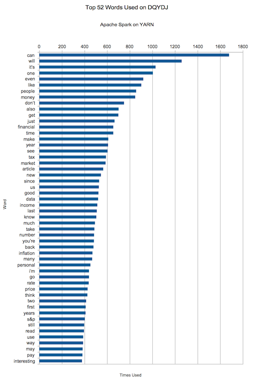 现在,准备念出咒语,让运行在 YARN 上的 Spark 跑起来,你可以看到我在 DQYDJ 使用最多的单词是哪一个。