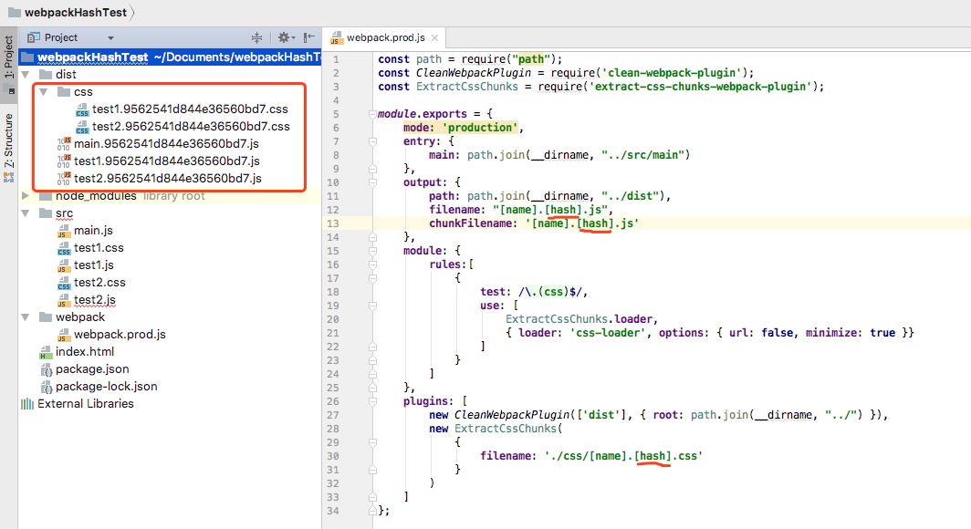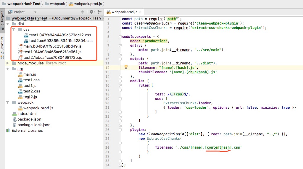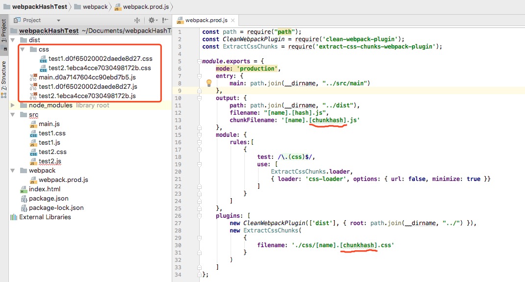 但是这样又有一个问题,因为我们是将样式作为模块import到JavaScript文件中的,所以它们的chunkhash是一致的,如test1.js和test1.css: