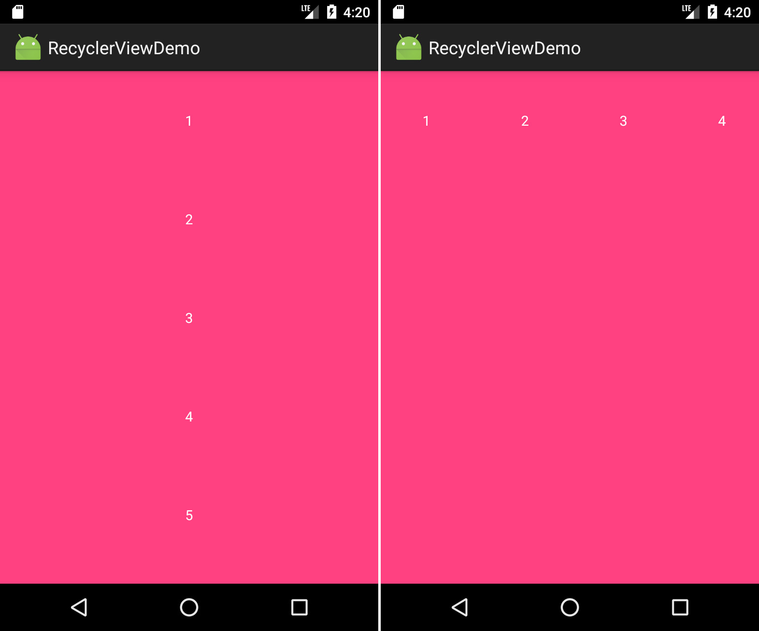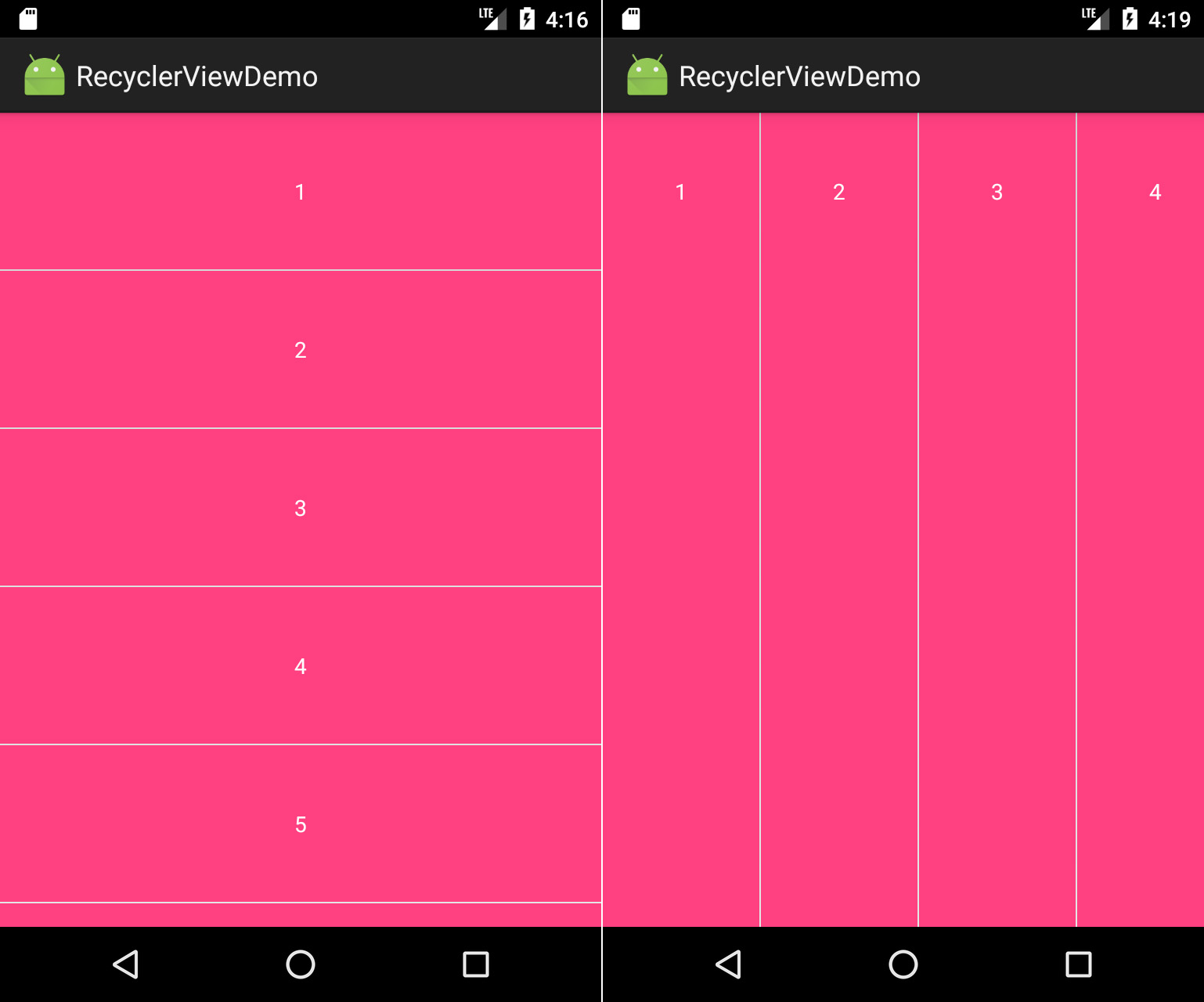 LinearlayoutManager是LayoutManager的默认实现。你可以使用这个类来创建垂直或水平列表。