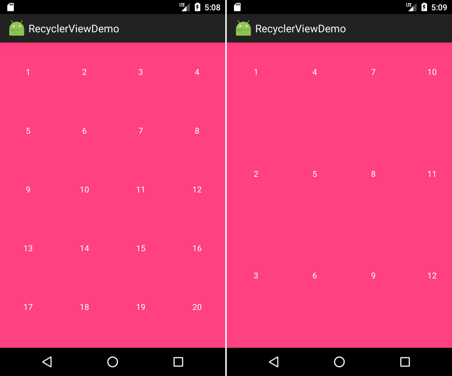 // 设置纵向的4列的表格布局GridLayoutManager layoutManager = new GridLayoutManager(this,4,GridLayoutManager.VERTICAL,false); recyclerView.setLayoutManager(layoutManager);// 设置横向的3行的表格布局GridLayoutManager layoutManager = new GridLayoutManager(this,3,GridLayoutManager.HORIZONTAL,false); recyclerView.setLayoutManager(layoutManager);