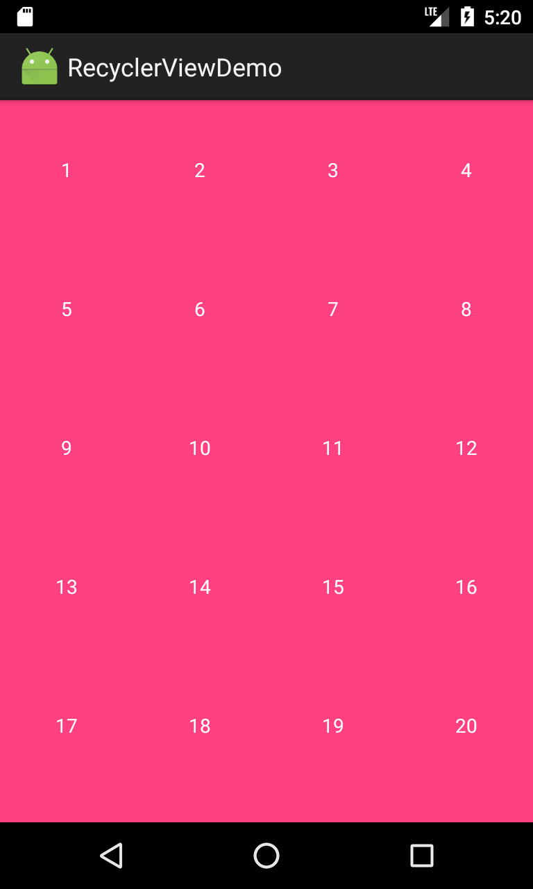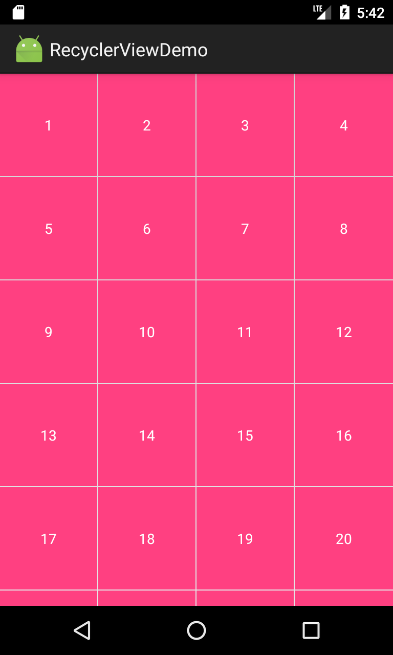 按照上述的方法,我们可以自定义一个DividerGridItemDecoration。由于代码篇幅过长,我们在附件中给出。我们给GridLayoutManager设置DividerGridItemDecoration,运行效果如下:
