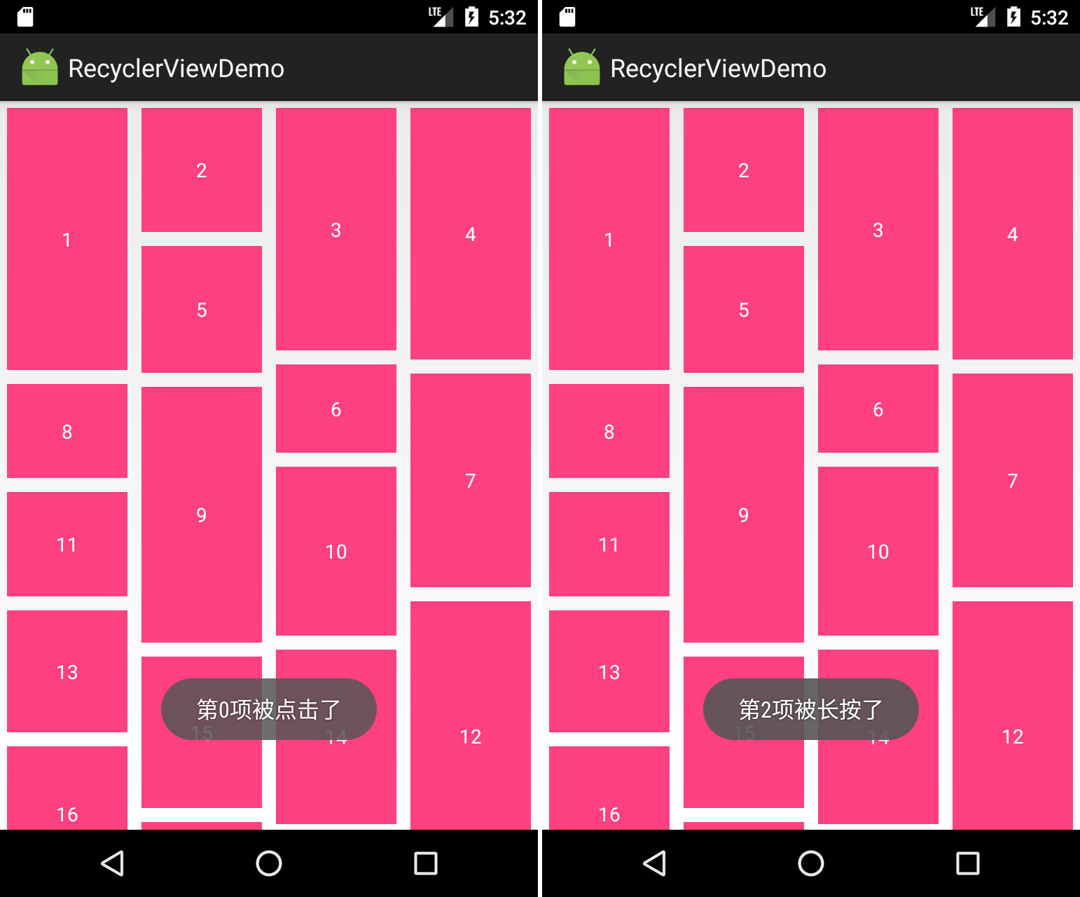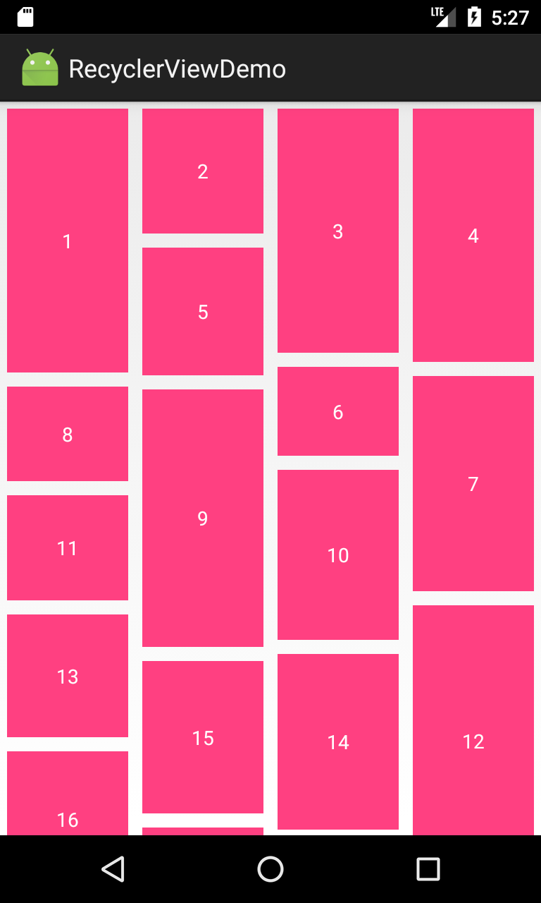 我们看效果和GridLayoutManager没有什么区别呢,那我们来小小的修改一下,你就可以看到它的强大。