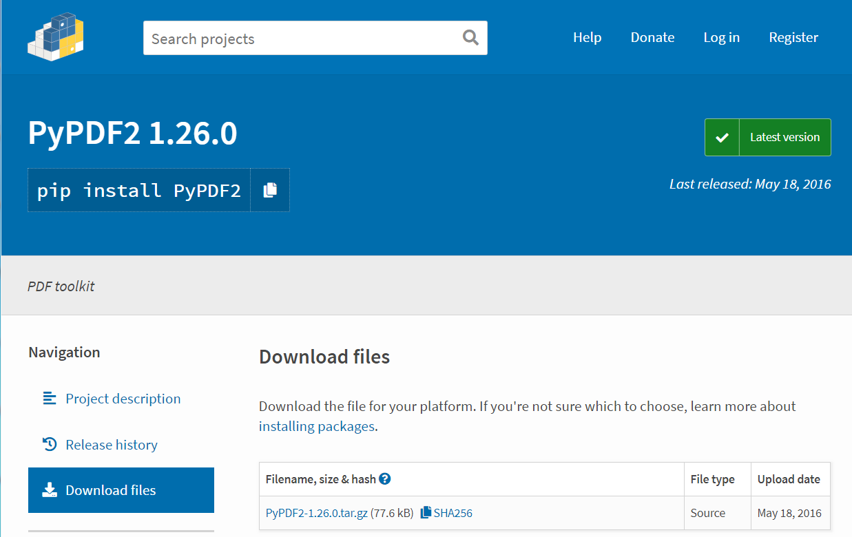 在https://pypi.org/project/PyPDF2/ 中搜索PyPDF2 1.26.0可以安装包。