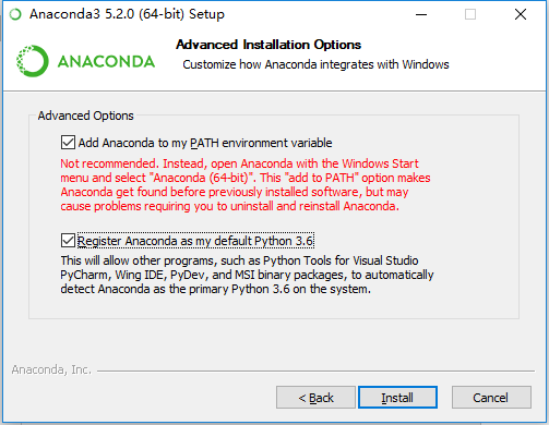 勾选【Add Anaconda to my PATH environment varable(将Anacondata添加环境变量)】